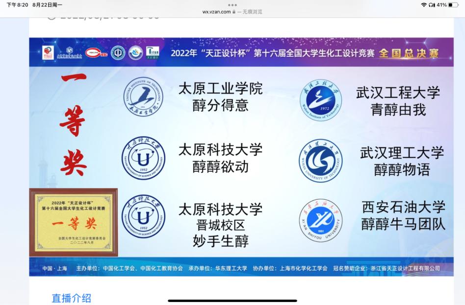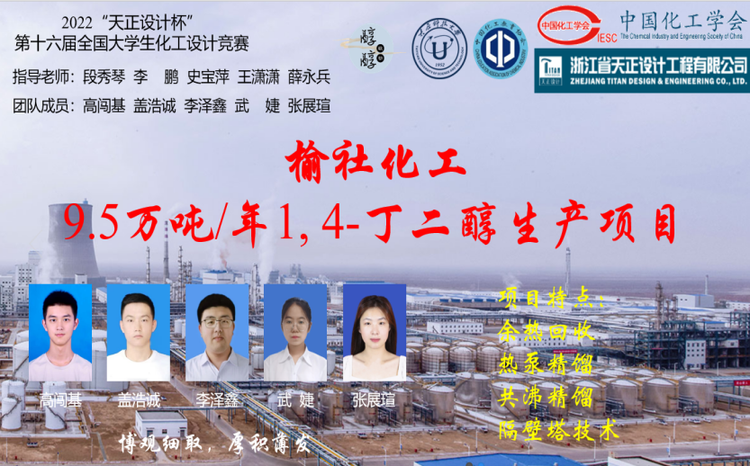 8月22日,2022年“天正设计杯”第十六届全国大学生化工设计竞赛全国总决赛在华东理工大学落下帷幕,我校“醇醇欲动”团队(队员:高闯基、盖浩诚、李泽鑫、武婕、张展瑄)及我校晋城校区“妙手生醇”团队(队员:白宇欣、张雅奇、刘杰、杜磊、徐浩鑫)历经西北赛区预选赛和全国总决赛,在作品设计和现场答辩中脱颖而出,双双荣获全国一等奖,再次取得优异成绩,这也是我校连续9届晋级全国总决赛并获一等奖。