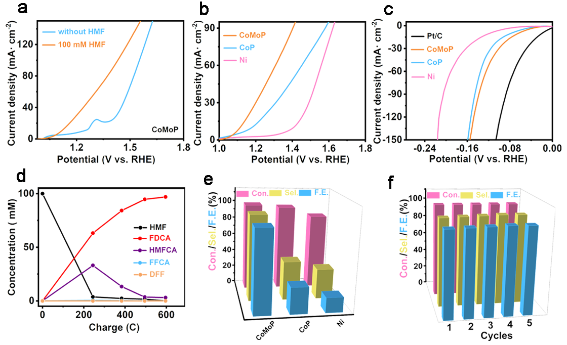 Fig. 2. a,b) Polarization curves of CoMoP, CoP, and Ni foam. c) HER polarization curves for CoMoP, CoP, and Ni foam. d) Concentration curves with the reaction for HMF, FDCA, HMFCA, FFCA, and DFF during the HMFOR. e) HMF conversion, FDCA selectivity, and Faraday efficiency of CoMoP, CoP, and Ni foam. f) The HMFOR of CoMoP at five successive cycles.