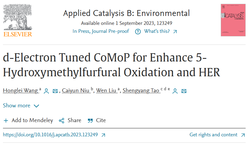 Honglei. Wang*, Caiyun. Niu, We. Liu, Shengyang. Tao*, d-Electron Tuned CoMoP for Enhance 5-Hydroxymethylfurfural Oxidation and HER, Applied Catalysis B: Environmental, doi: https://doi.org/10.1016/j.apcatb.2023.123249.