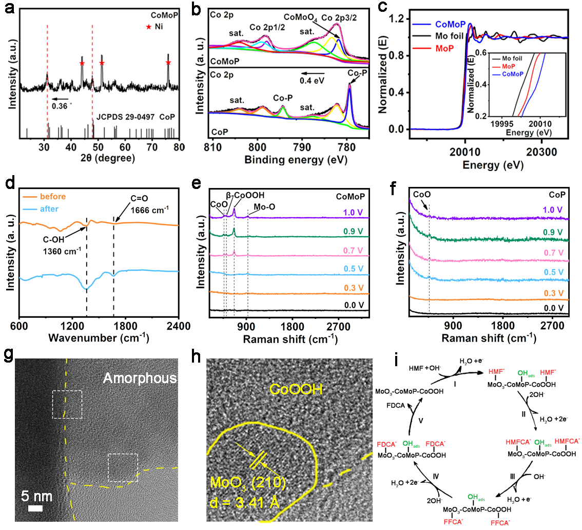 图4介绍了与CoP相比,CoMoP的衍射峰负移了0.36°。衍射峰的移动可能是由于Mo原子取代部分Co原子调整了晶格参数引起的。Co的XPS光谱显示:与CoP相比,Co2p结合能正移约0.4 eV,表明嵌入的Mo原子可以改变Co中心的电子结构。XANES测试结果表明CoMoP中Mo的平均价态高于Mo箔和MoP。这是由于Mo的掺入导致CoMoP中Mo和Co的价态更高,促进了HMFOR。与裸CoMoP相比,使用过的CoMoP对羰基和羟基表现出更大的红外吸附强度,这证实了使用过的CoMoP表面更有利于吸附反应物。当施加的电压大于0.5 V和大于0.7 V时,Mo-O物种和β-CoOOH物种的拉曼峰出现,表明催化剂表面发生了重构,使CoMoP的催化活性得到了优化。同时,TEM表征表明,在HMFOR之后,CoOOH和MoO3在CoMoP表面上形成,这进一步证实了在HMFOR期间CoMoP表面重构形成了CoOOH以及Mo-O物种。在上述分析的基础上,提出了重构的CoMoP上的HMFOR机制。HMF分子选择性地吸附或结合在重构的CoMoP上,并且与OHads物种进行反应。然后,氧化HMF分子的羟基和醛基,得到相应的HMFCA、FFCA、FDCA和H2O。