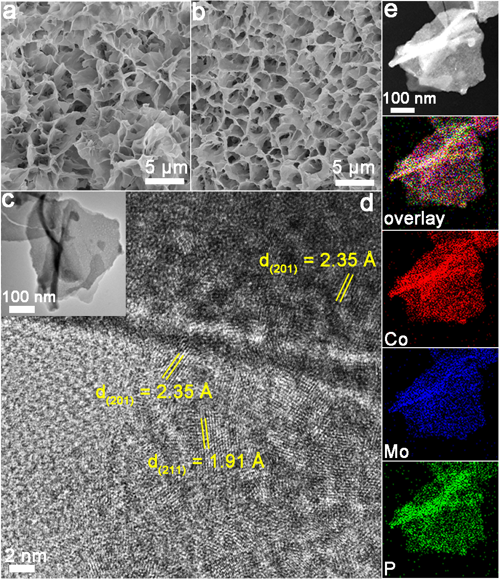 Fig. 1. (a) SEM images of CoMo-precursors and (b) CoMoP. (c) TEM image, (d) HRTEM image, and (e) TEM elemental mapping images of CoMoP.