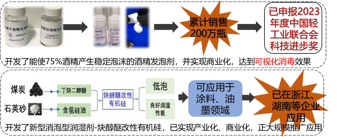 从分子设计入手,开展新型功能性表面活性剂、塑料助剂、金属界面改性剂、新型染料等的清洁生产工艺及应用基础研究。开发了能使75%酒精产生稳定泡沫的酒精发泡剂,并实现商业化,达到可视化消毒效果,已申报2023年度中国轻工业联合会科技进步奖。开发了新型消泡型润湿剂-炔醇醚改性有机硅,可应用于涂料、油墨领域,已实现产业化、商业化,已在浙江、湖南等企业应用。未来拟在特种有机硅表面活性剂、生物质基表面活性剂、高性能塑料助剂、新型荧光染料、导电油墨等领域继续开展创新型研究。